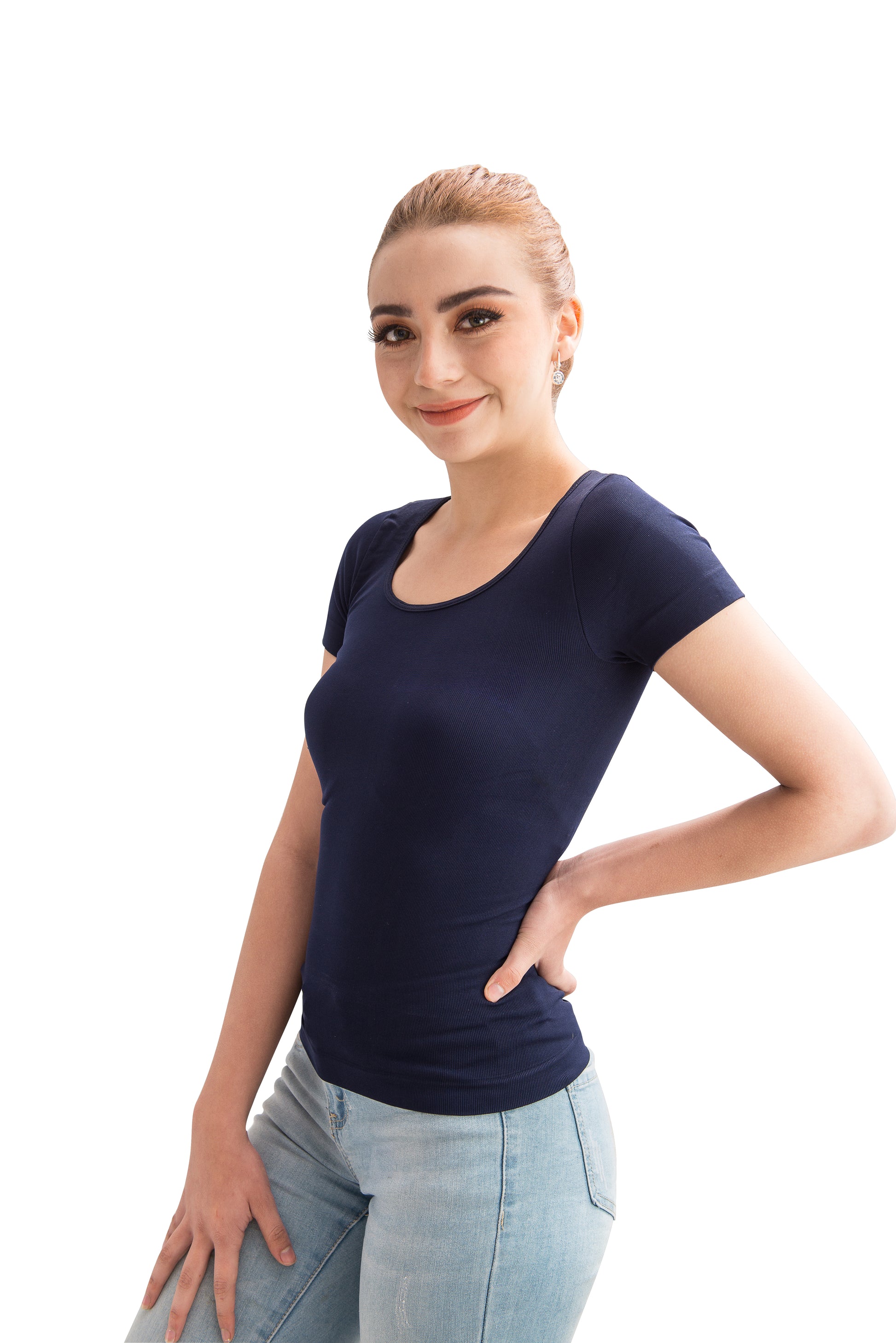 Blusa versátil de manga corta con cuello redondo. Diseño clásico para uso diario, ligera y flexible, perfecta para combinar con cualquier outfit mientras brinda confort continuo.